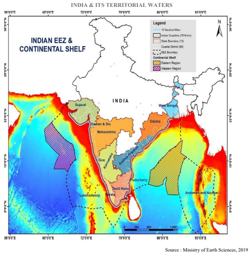 India has nine coastal states, 7500 km long seashore, over 2 million square kiometers of economic zones, total 199 ports (only 12 major).